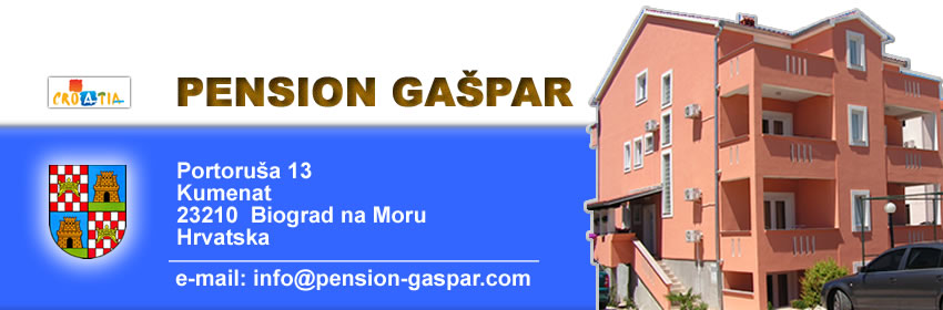 Pension Gašpar se nachází v malebné a klidné vilové čtvrti zvané Kumenat, která je součástí neméně krásného městečka Biograd na Moru. Vilová čtvrť Kumenat, vzdálená od centra Biogradu 2 kilometry, je s městem propojena nově vybudovanou kolonádou, vedoucí podél mořského pobřeží lemovanou stoletými borovicemi. Písčitá a oblázková pláž s restaurací je od pensionu Gašpar vzdálena pouhých 150 metrů, hlavní písčitá pláž 500 metrů. Ve sklepních prostorech pensionu Gašpar můžete navštívit stylovou restauraci, nabízející velice příjemné posezení. Nedílnou součástí restaurace je i venkovní terasa s pergolou a grilem. Restaurace pensionu Gašpar nabízí velké množství tradičních specialit Dalmácie. V našem pensionu jsou veškerá vaše přání splněna předem. Zároveň si vás dovolujeme ujistit, že zde nenarazíte na jazykové bariéry, domluvíte se s česky, anglicky, německy a italsky. V pensionu je 5 luxusně vybavených apartmánů, 11 dvojlůžkových a trojlůžkových pokojů s celkovou kapacitou 55 lůžek. Součástí vybavení je KLIMATIZACE,TV, SAT, TELEFON atd. Z velké části ubytovacích prostor se vám naskýtá překrásný pohled na Pašmanský kanál.